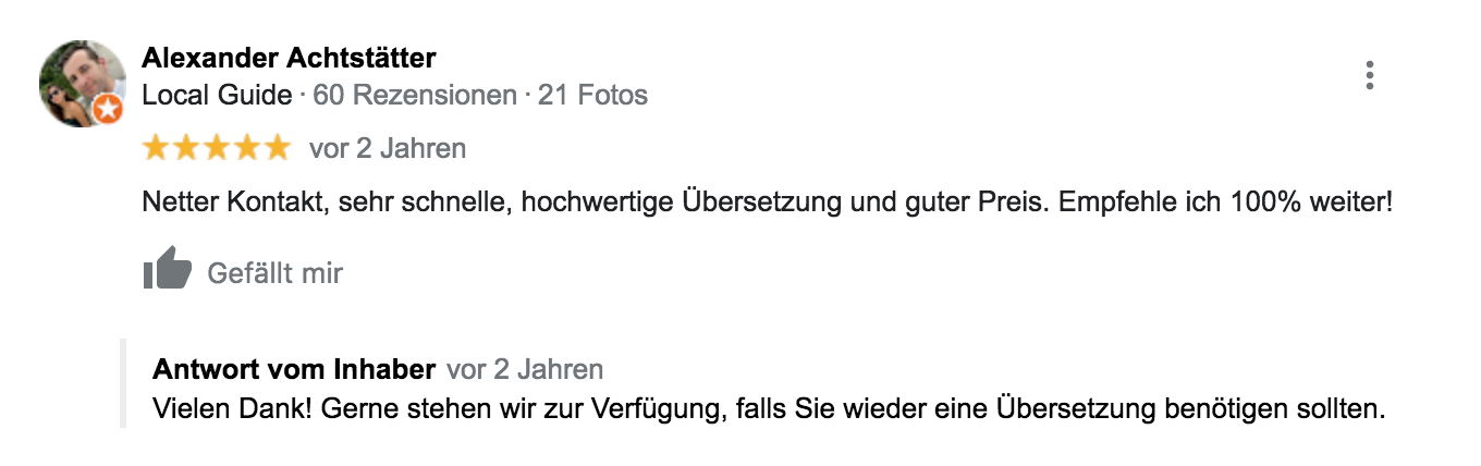 Erfahrung mit beglaubigten Übersetzungen, garantiert Ihnen eine zügige Bearbeitung ohne jegliche Kompromisse bei der Qualität. Wir sind Ihr zuverlässiger Übersetzer Englisch Deutsch,